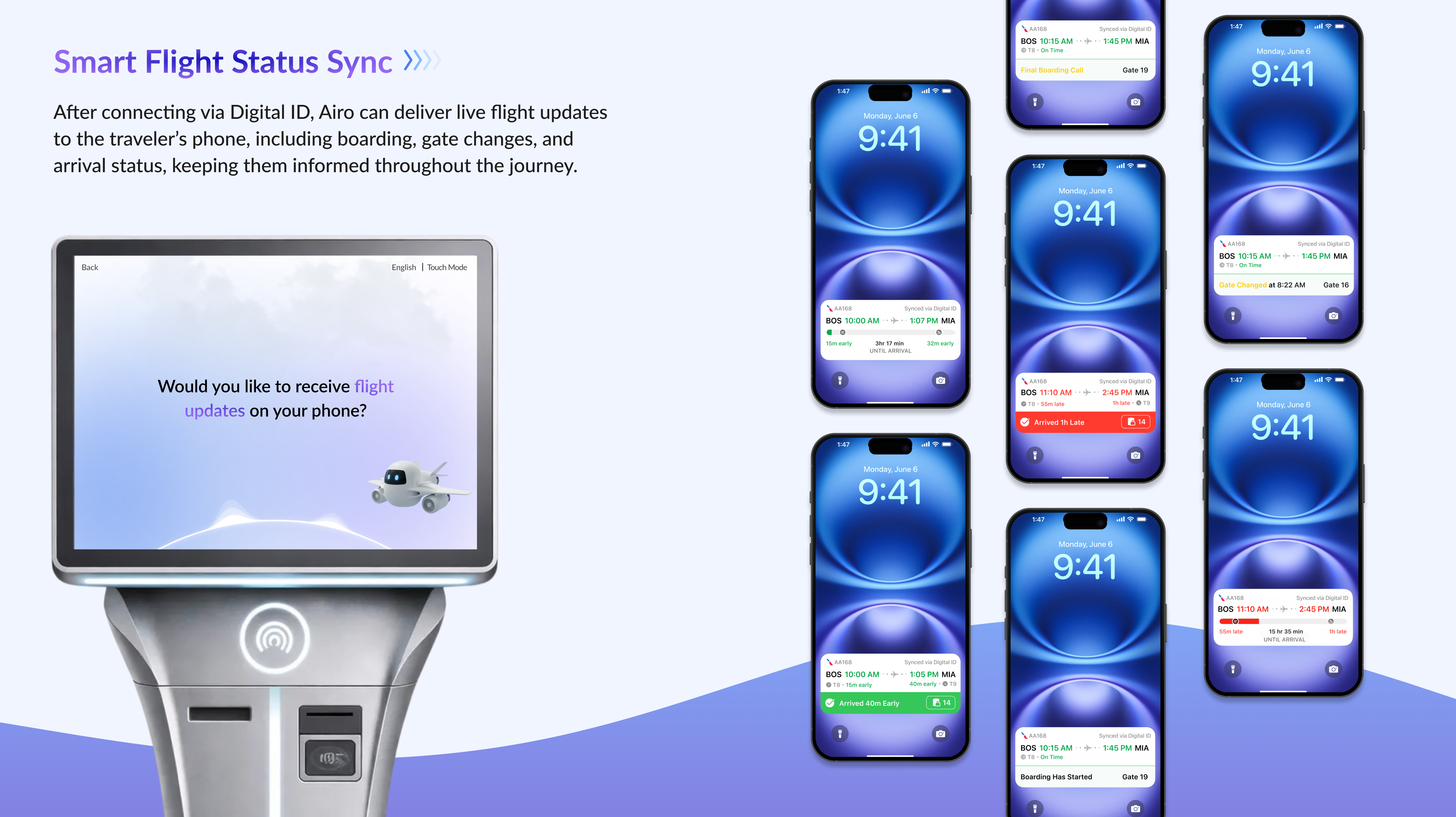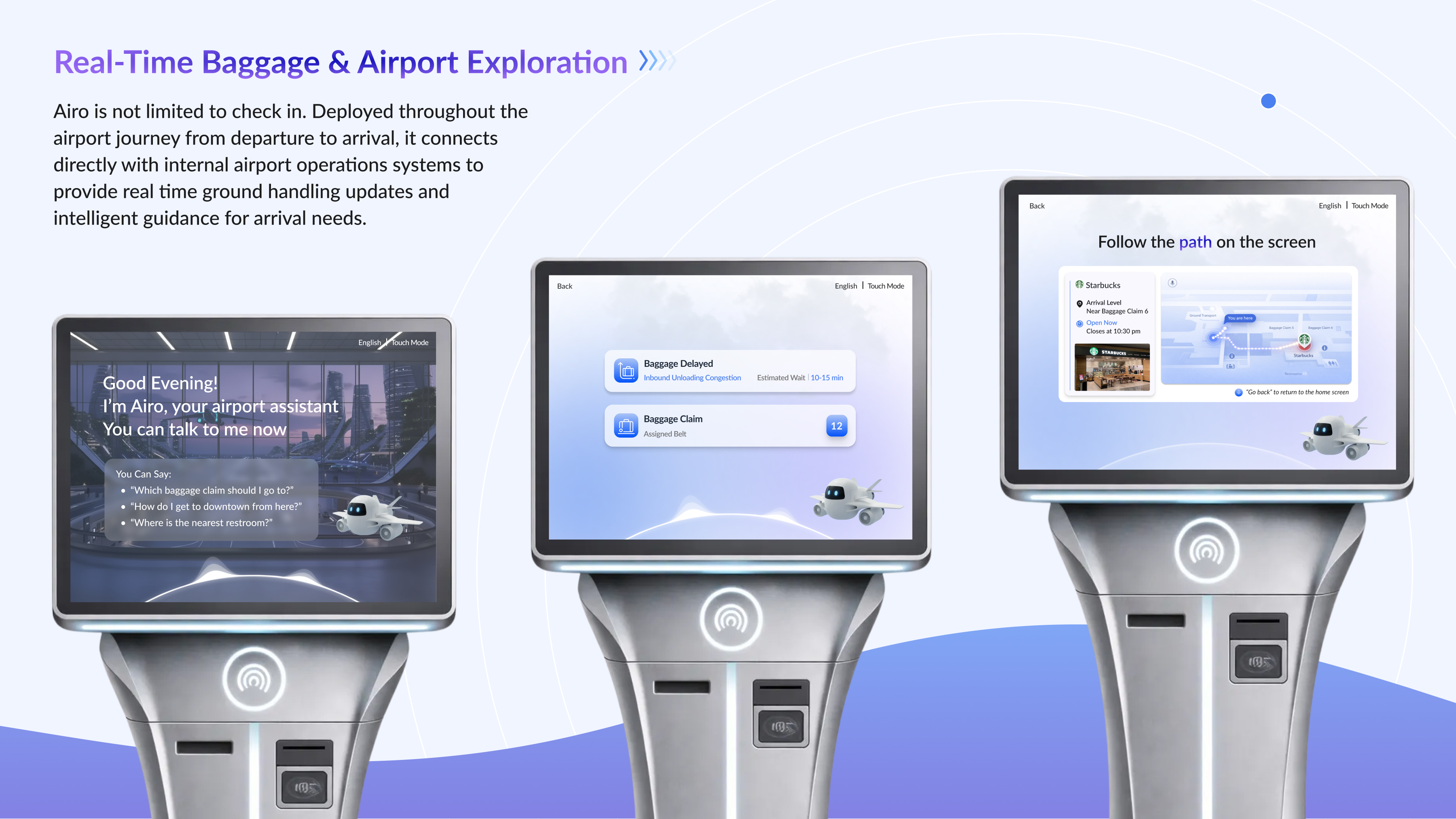 Once connected, Airo continues to support travelers beyond the kiosk. Flight updates, gate changes, and arrival information are synced directly to personal devices. Deployed across departure, transit, and arrival zones, Airo also provides real-time baggage updates and practical AI-driven airport guidance.