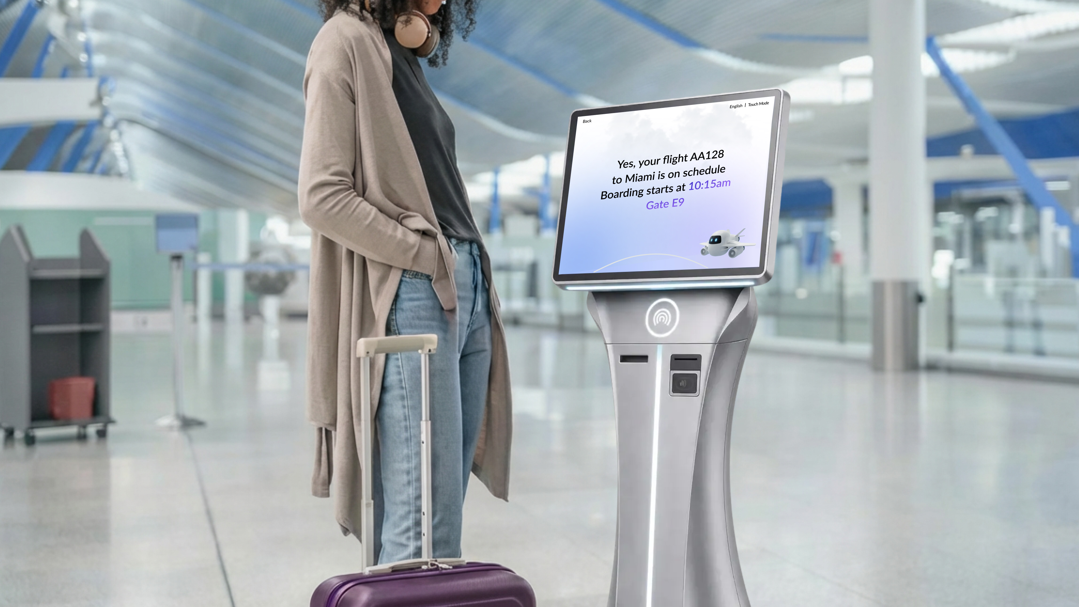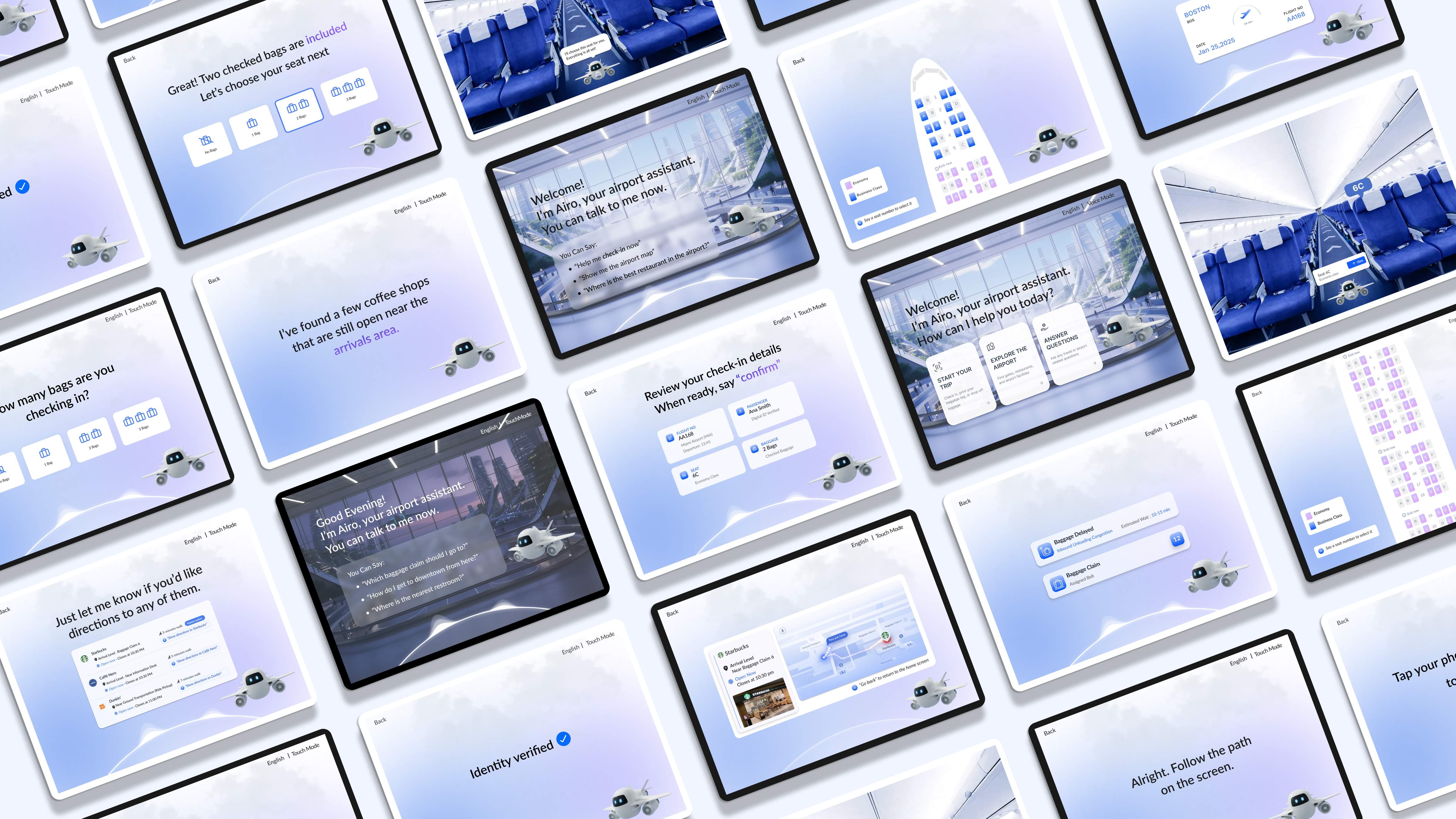 Airo reframes the kiosk as an intelligent, approachable assistant rather than a single-purpose terminal. By prioritizing hands-free, voice-driven interaction, Airo reduces physical effort for travelers, particularly in busy travel moments when managing luggage, documents, and surroundings simultaneously. Voice interaction is designed as the default to support movement and situational awareness. At the same time, Airo allows users to switch to a traditional touch-based interaction when needed, supporting inclusive use across different abilities and environments.