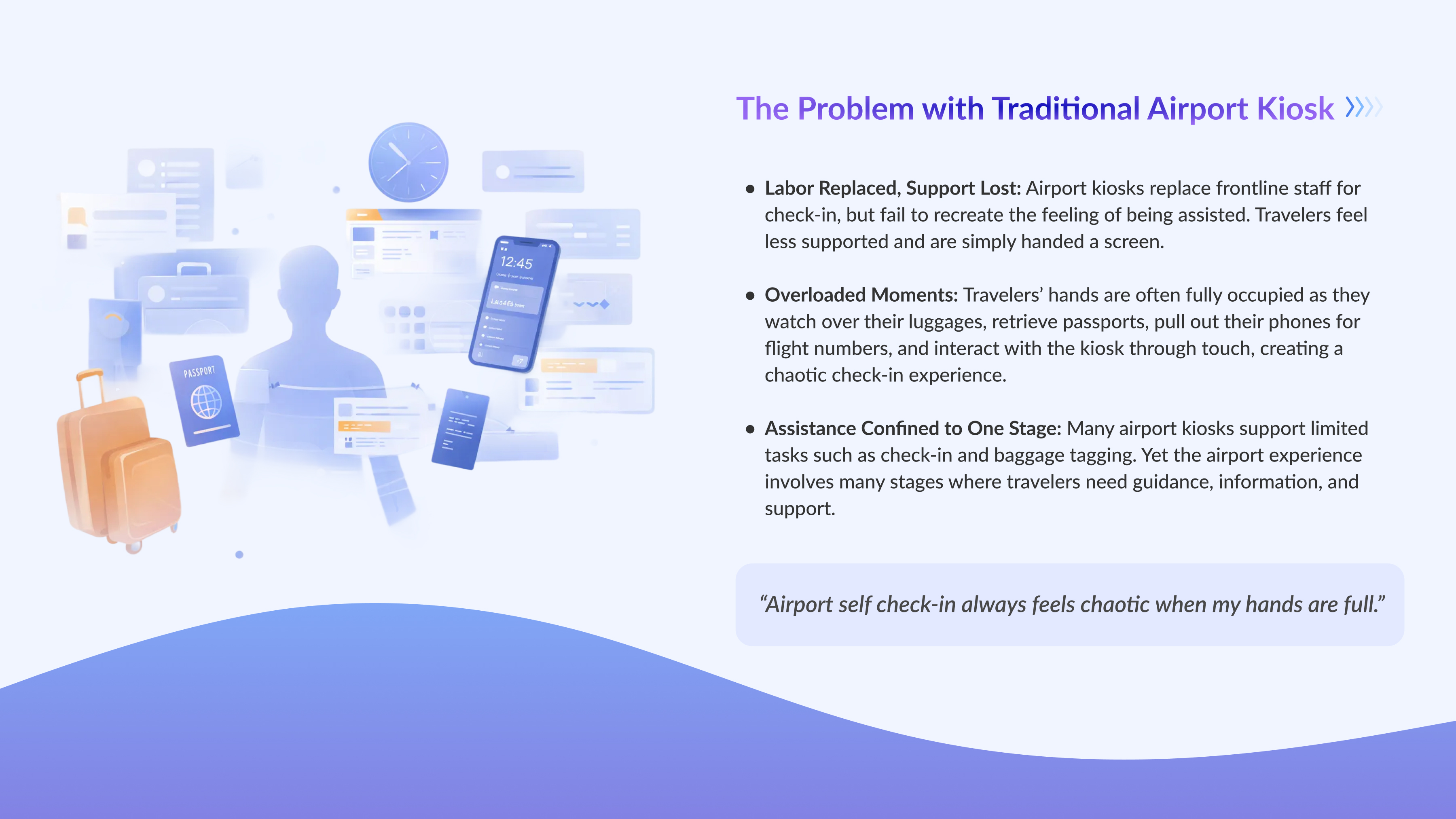 Airo is a voice-first, AI-integrated airport kiosk designed to bring a sense of assistance back into self-service travel environments. While traditional kiosks replace frontline staff, they often reduce support to touch-based interfaces, asking travelers to complete multiple tasks at moments when their hands and attention are already occupied.