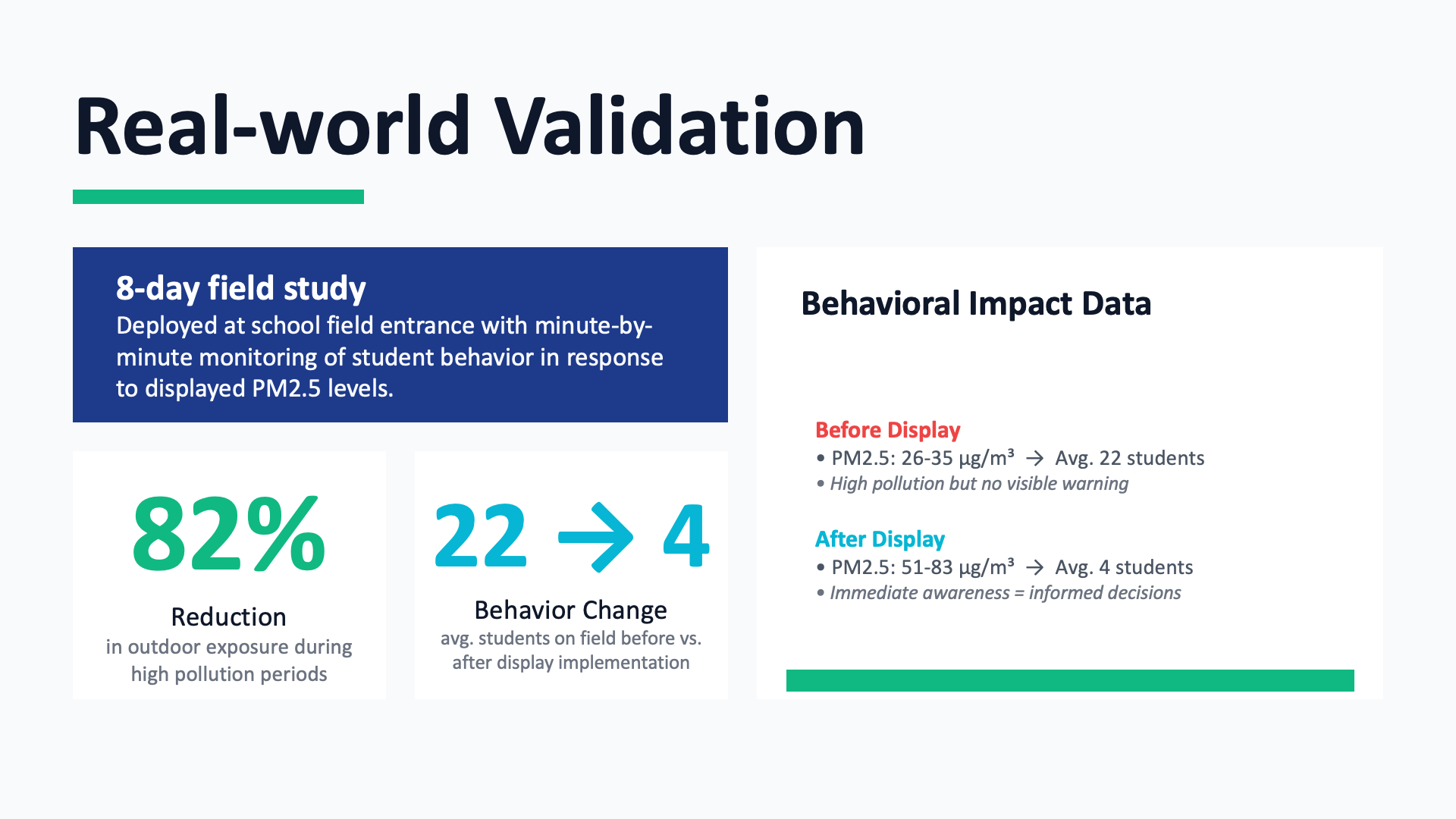 Furthermore, experimental results have revealed a significant decrease in the average time students linger outdoors during breaks following the implementation of the device. This noteworthy outcome not only highlights the effectiveness of the AirSense system but also underscores the tangible benefits of technological interventions in reducing health risks associated with poor air quality. Accordingly, this project represents a meaningful step toward creating a safer and healthier campus environment for all.