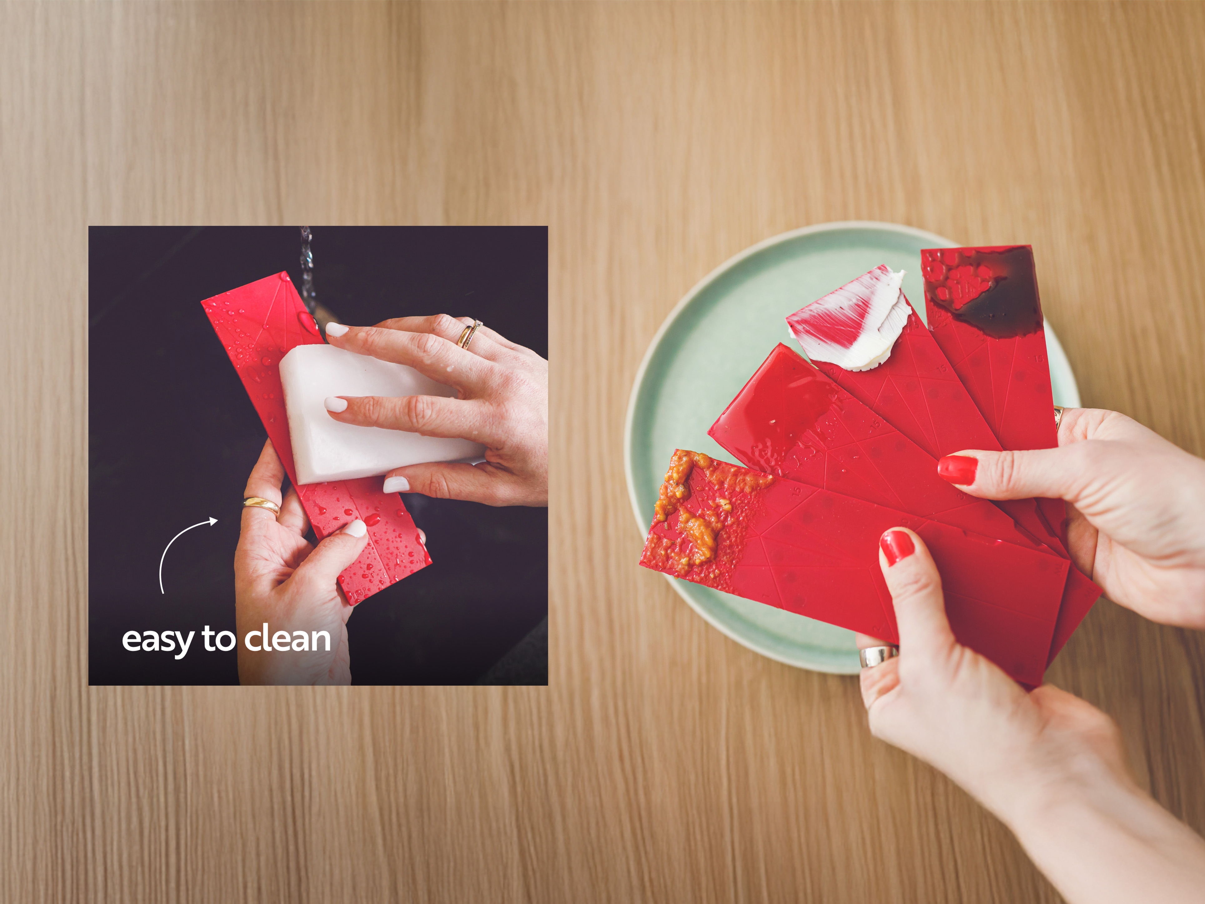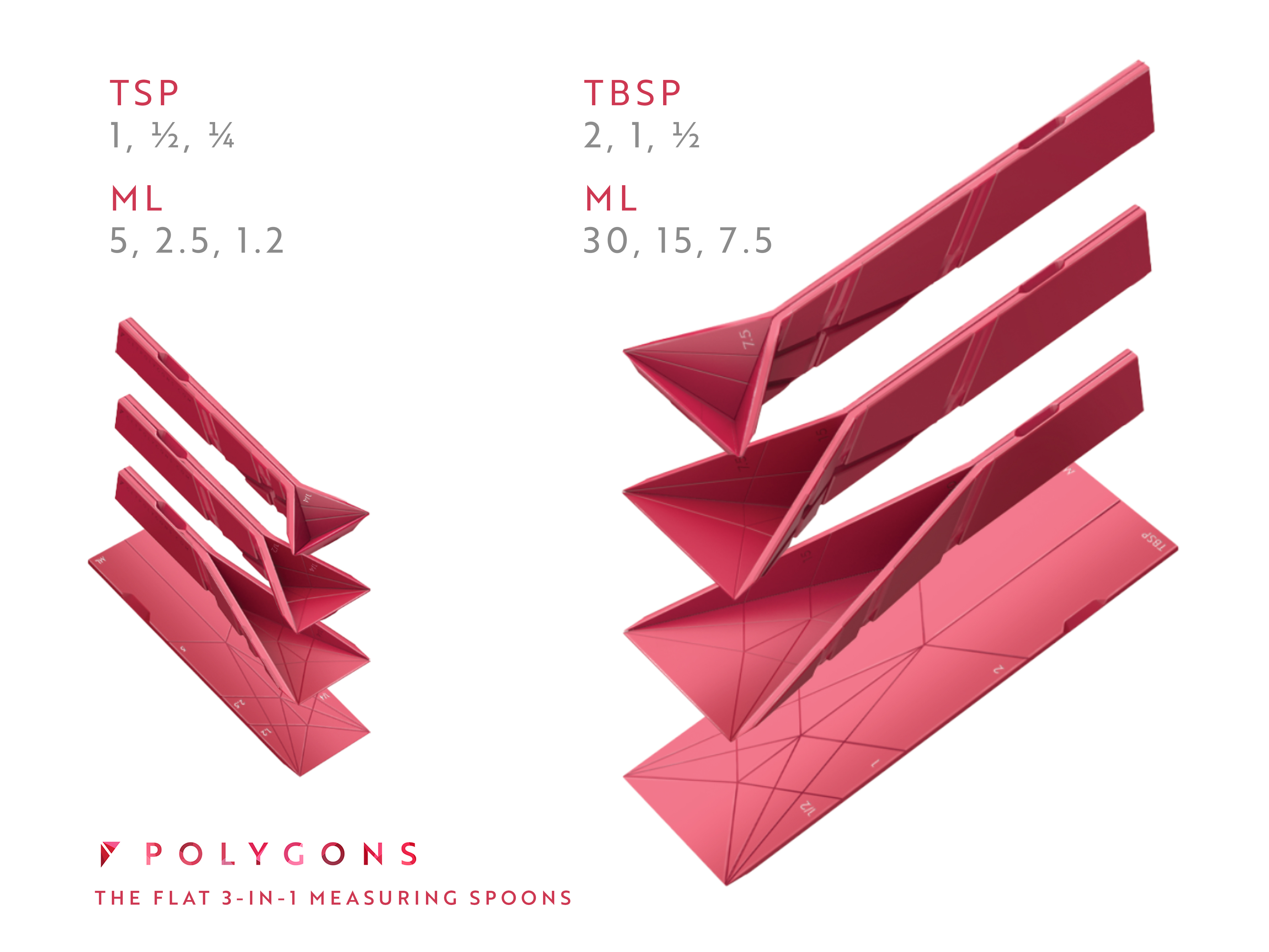 Polygons reinvents a 3000-year-old tool by compressing an entire set of measuring spoons into an origami-flat sheet, just 0.1 inches thin. Using precisely engineered multi-layer live hinges, one pinch along a crease instantly forms the three volumes cooks use most—½ Tbsp, 1 Tbsp, and 2 Tbsp on the large sheet, and ¼ tsp, ½ tsp, and 1 tsp on the small. Inserting a finger into the slotted groove lets the tool spring back to its bookmark-flat form, ready to clean in a single wipe. Hidden magnets allow it to live on the fridge, within reach and never lost in a drawer.