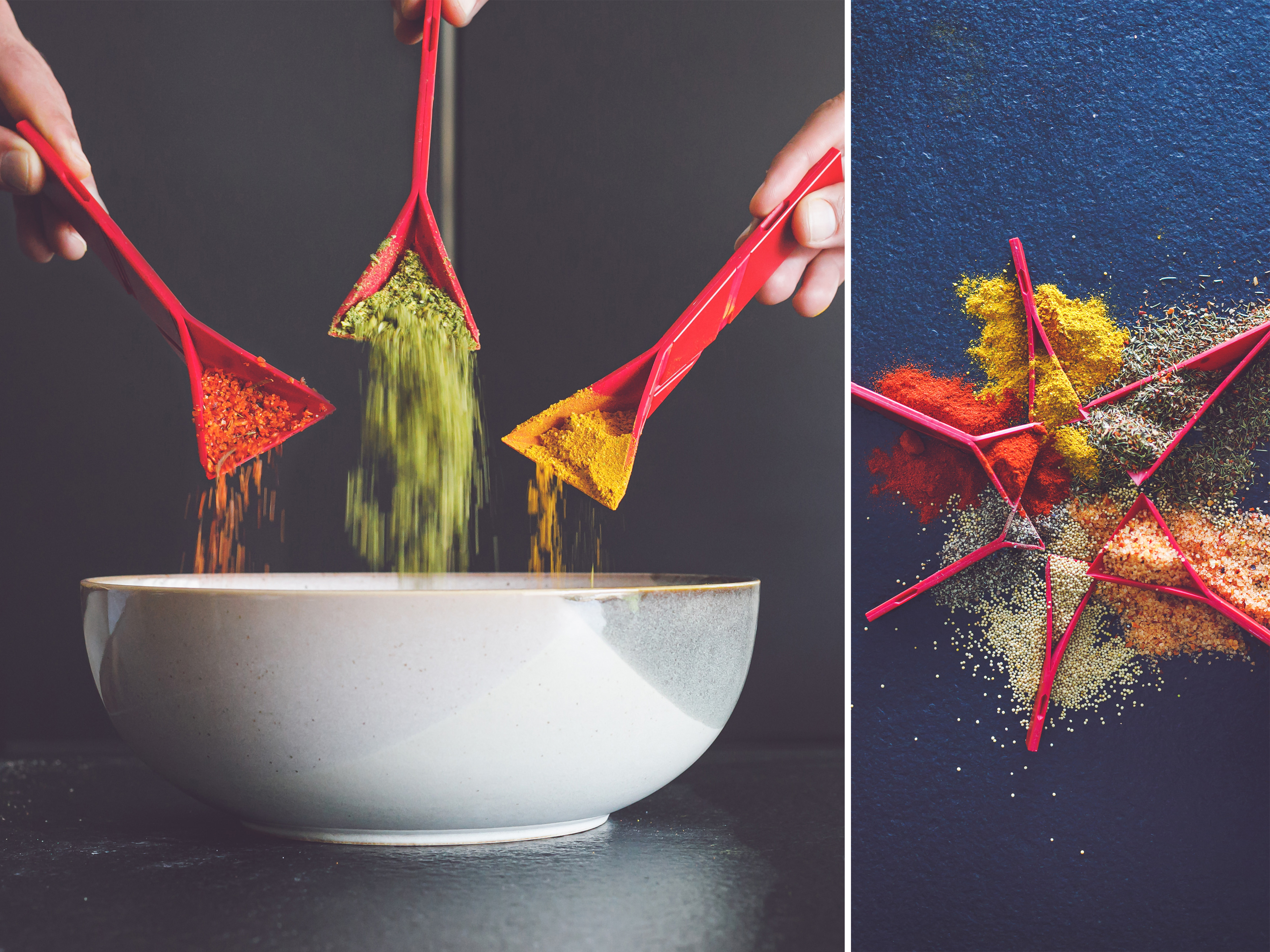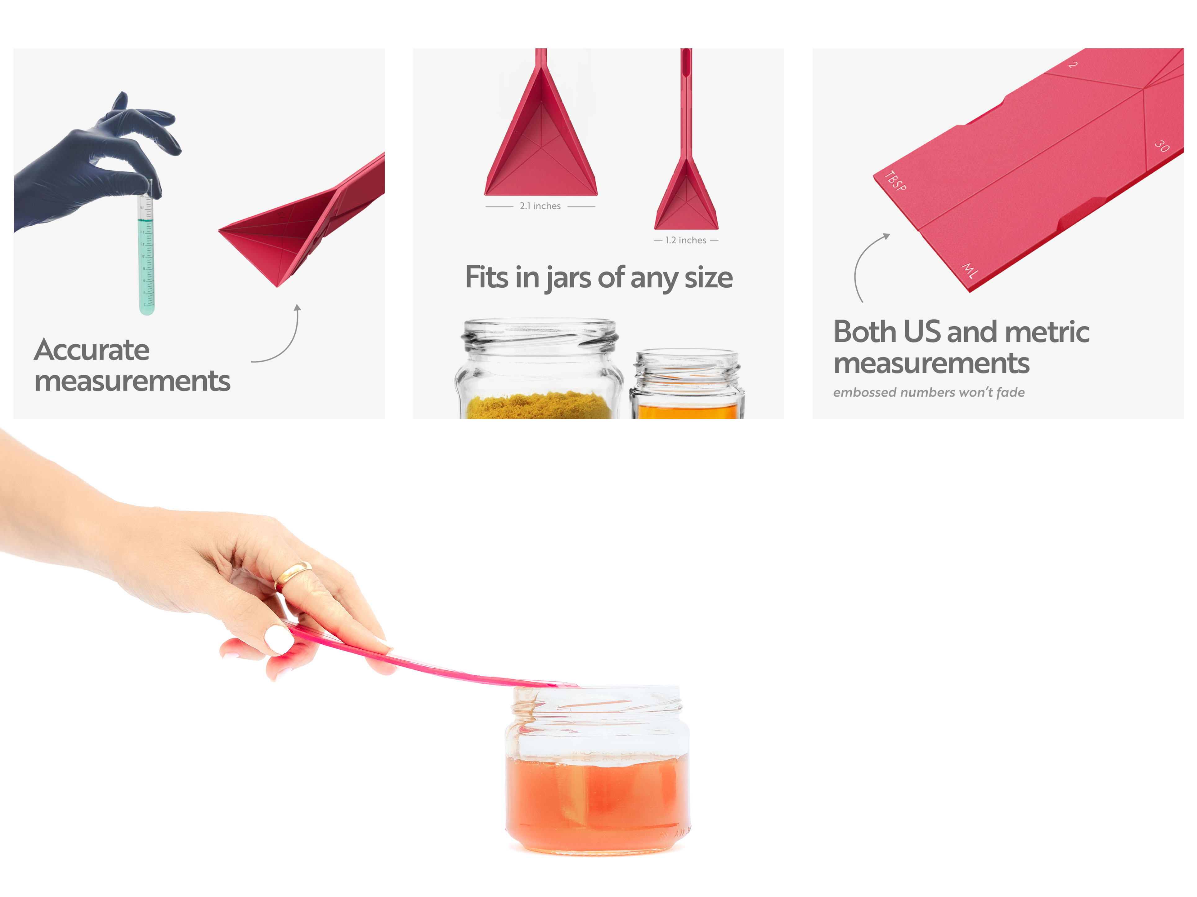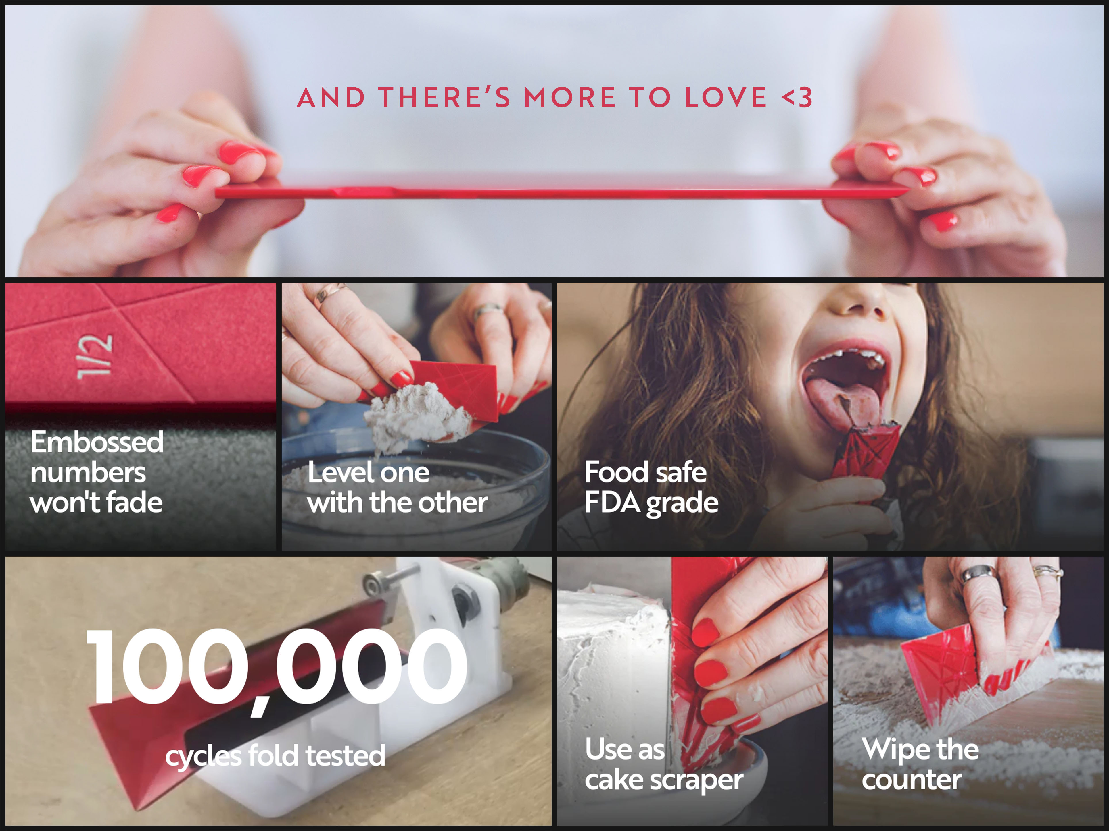 Polygons measures both wet and dry ingredients with extreme accuracy. Its flattening feature eliminates the "leftover struggle": after scooping, the rigid triangular bowls flatten to help in spreading or scraping sticky ingredients, reducing food waste dramatically. The slim profile slides into cookbooks or any drawer, and the flat face rinses in seconds, saving water and soap. With it's proprietary DuraBend technology, it is built to endure more than 100,000 bending cycles, it offers decades of reliable performance.