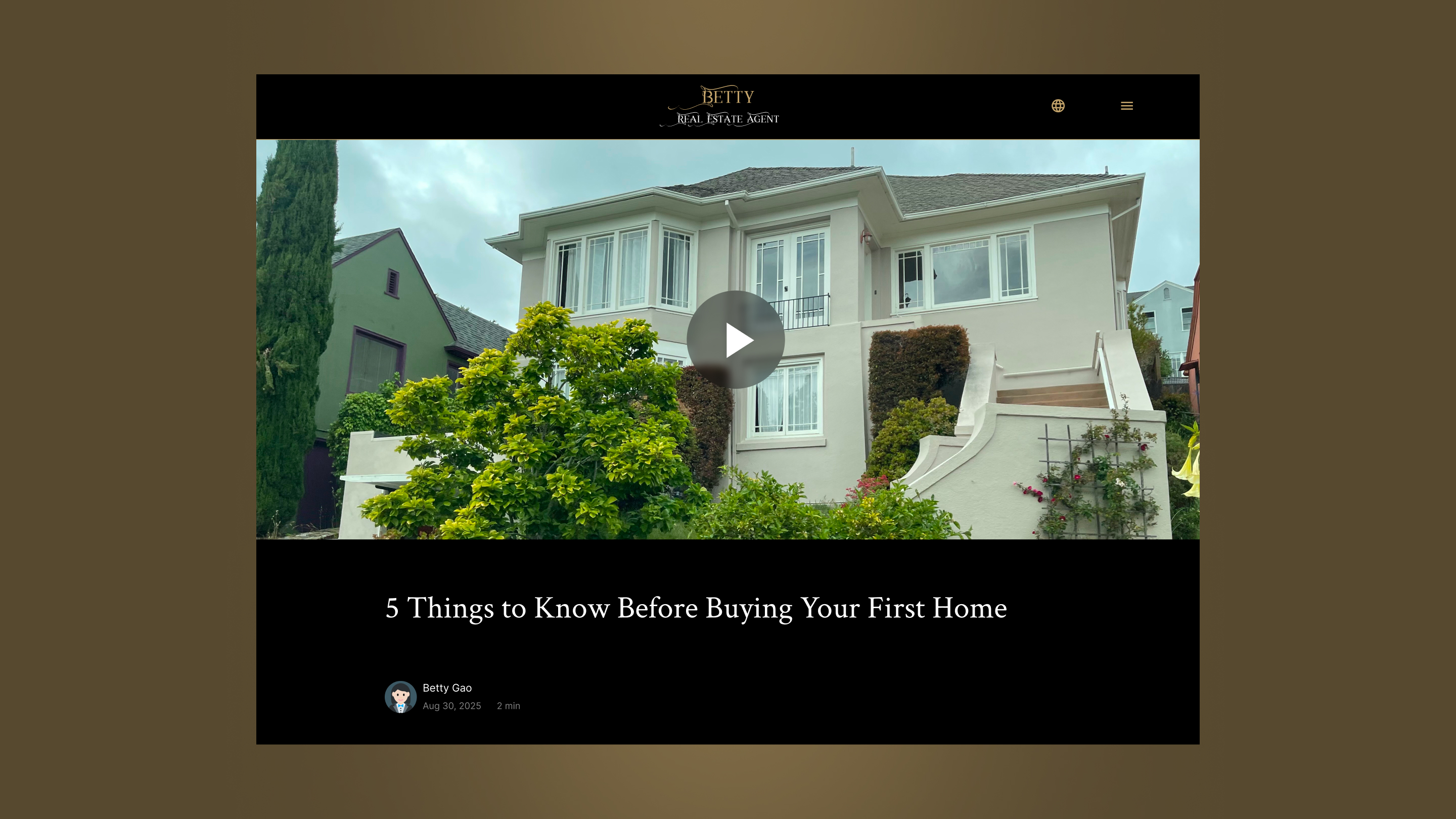 Additional sections include Blog, News, and Video pages, enabling agents to share professional insights, industry updates, and property tours. Video content can be filtered by time or popularity, and controlled loading improves site performance.