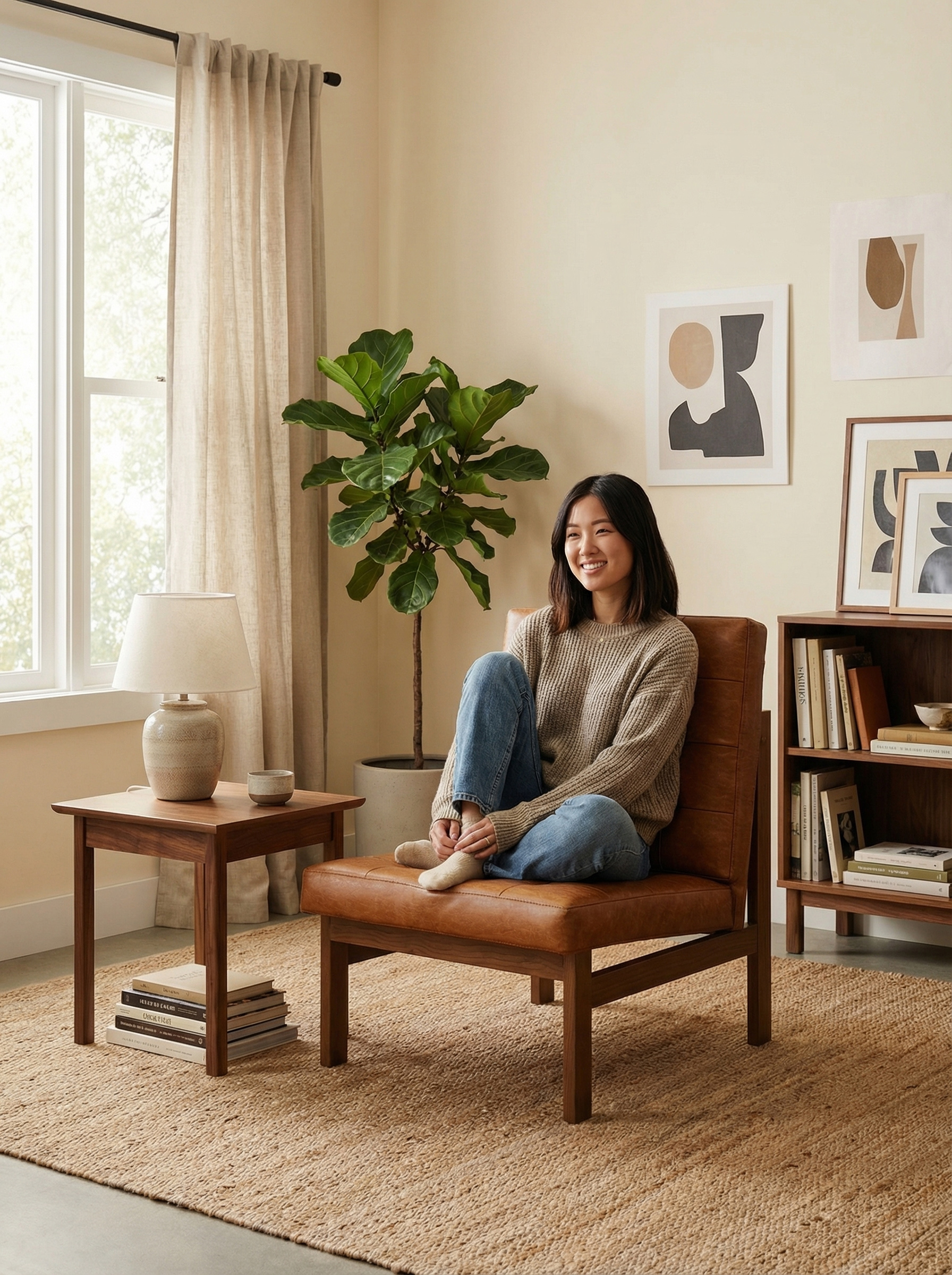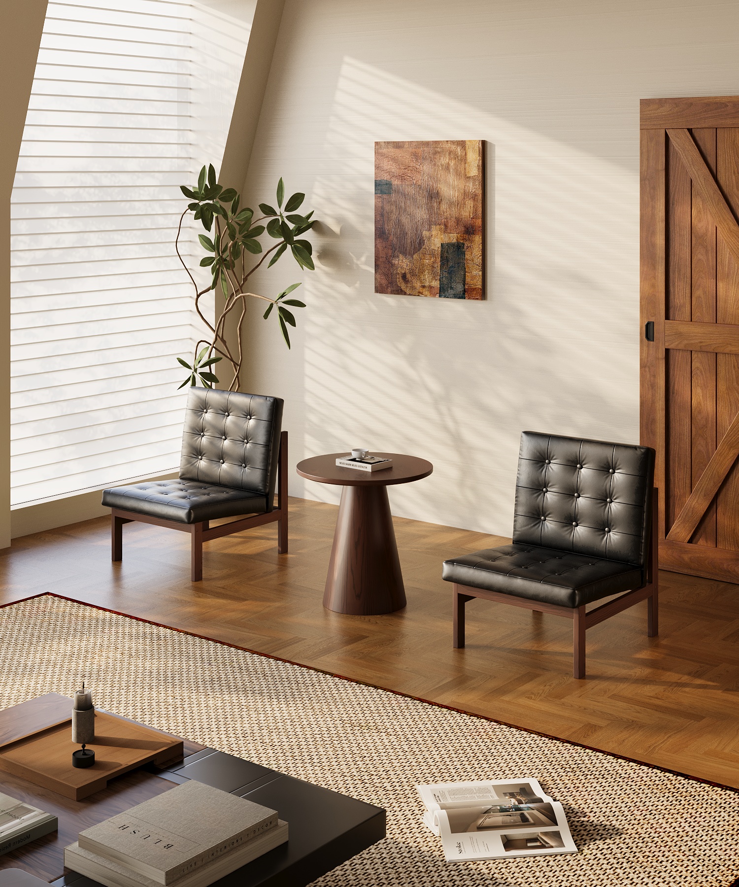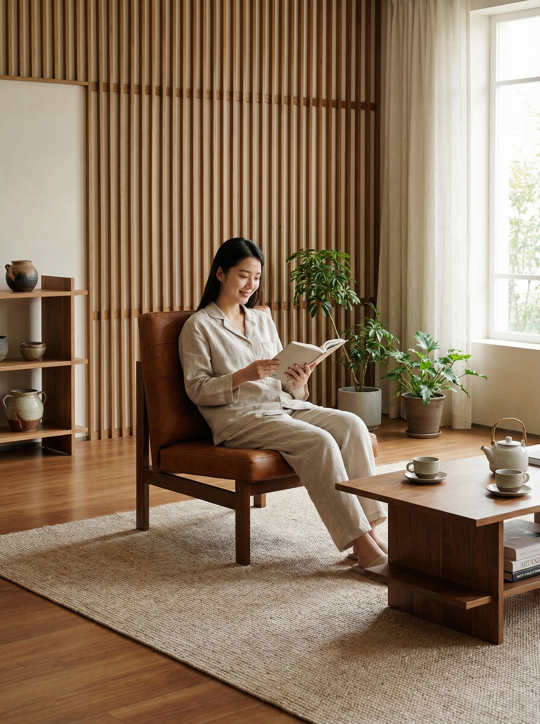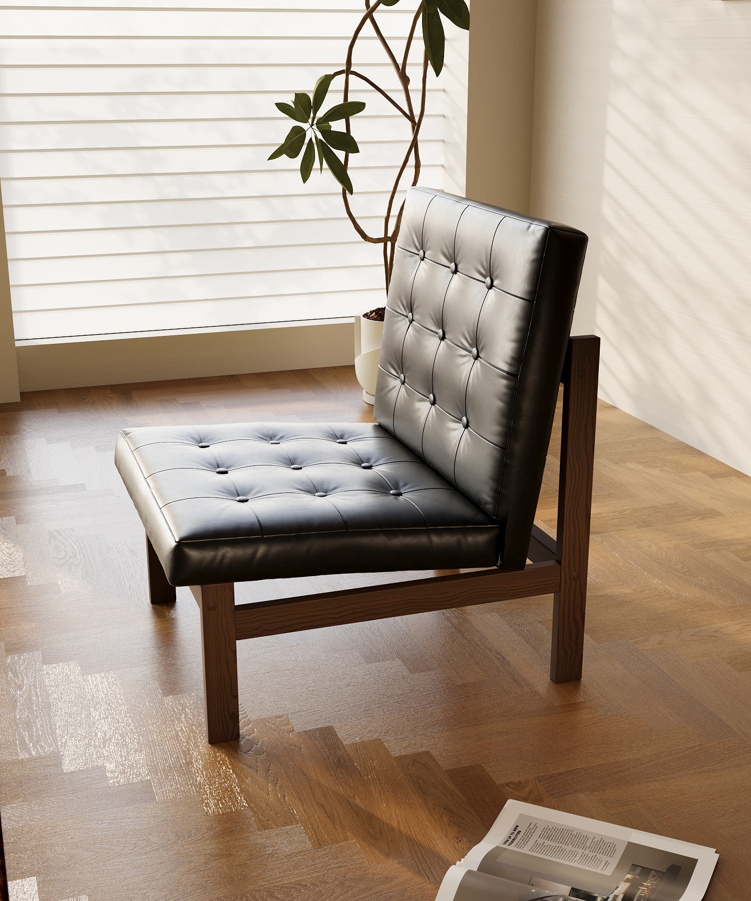 Visually, the Olly Chair revolves around three key qualities: order, relaxation, and warmth. Its square geometric form reflects the modernist principle of “form follows function,” creating a calm and stable visual presence that helps bring a sense of balance to contemporary living spaces. The grid-tufted upholstery softens the rigidity of leather through subtle curved surfaces created by the pull points, giving the chair a gentle retro elegance. Meanwhile, the combination of leather and solid wood establishes a dialogue between soft and rigid, smooth and textured, preventing visual monotony while achieving a balanced material harmony.