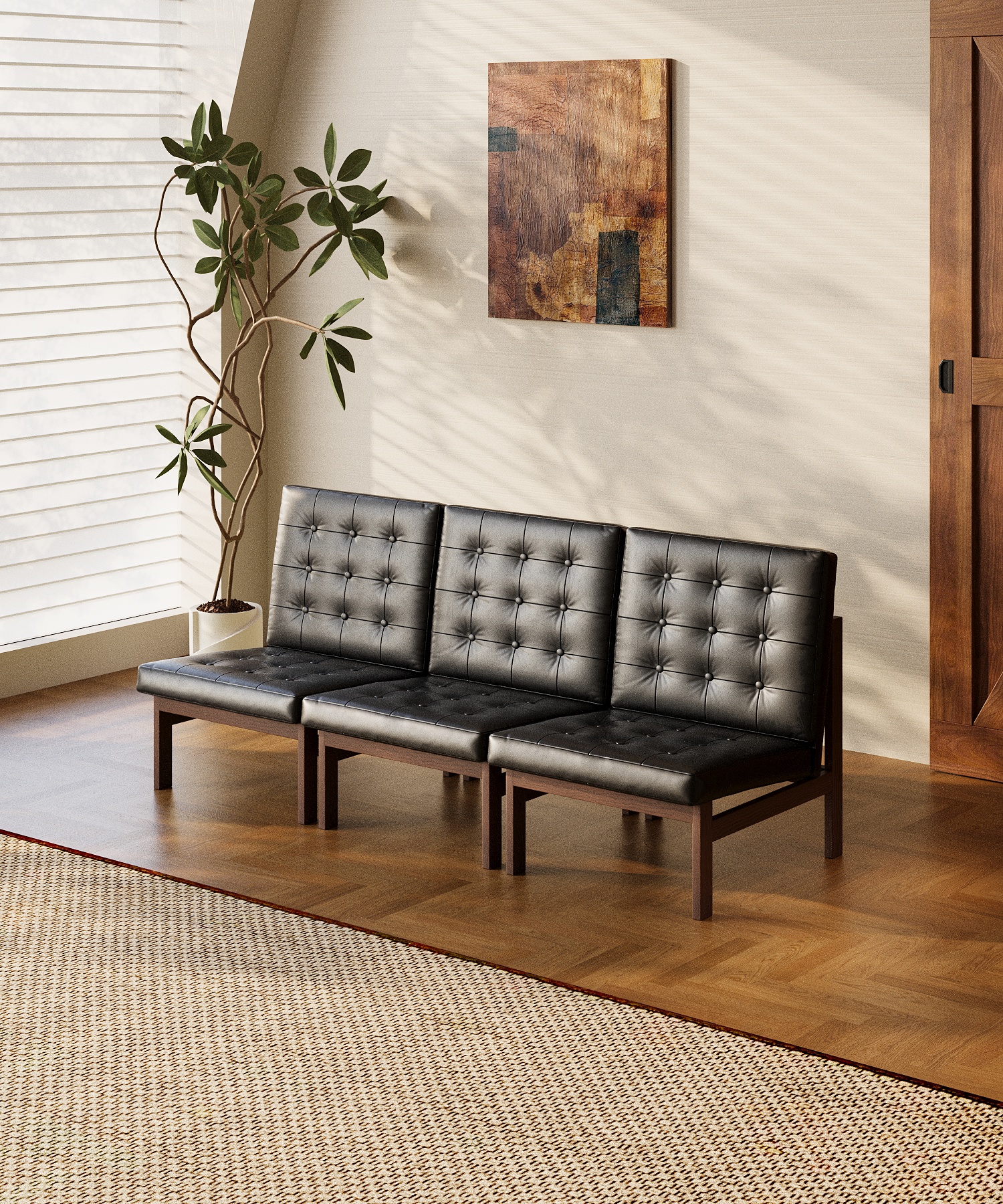 The chair adopts a fully open armless design, breaking away from the physical boundaries of traditional armchairs. This openness allows greater freedom of movement and accommodates a variety of sitting positions—from upright seating to casual side-sitting or cross-legged relaxation. Multiple chairs can also be arranged together to form modular seating combinations, transforming the chair into a flexible sofa-like configuration.