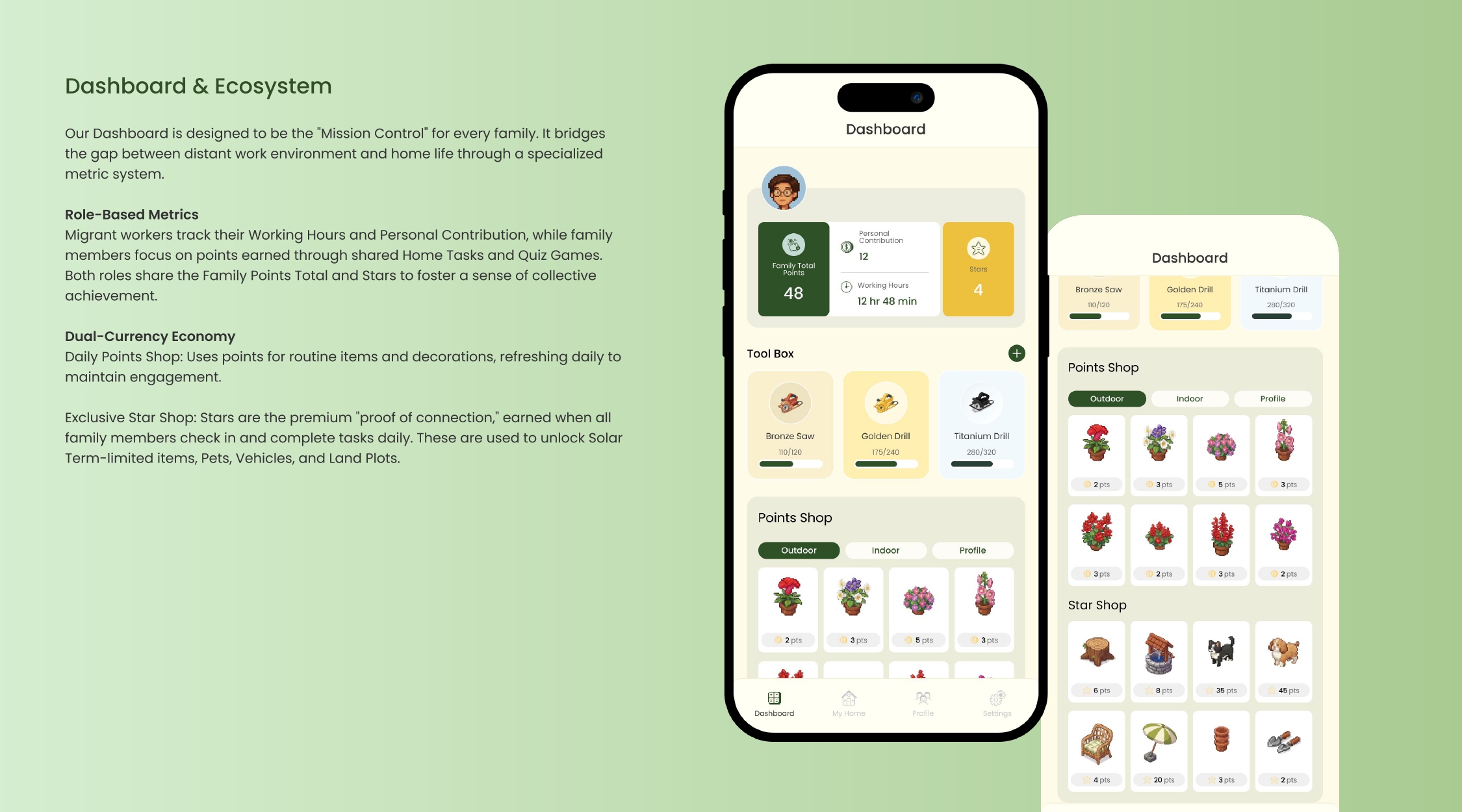 The platform translates everyday work activities into subtle digital signals that allow families to sense each other’s routines from afar. Instead of requiring active communication, moments such as tool usage, shift completion, or daily activities are transformed into small indicators of presence within a shared virtual home environment.