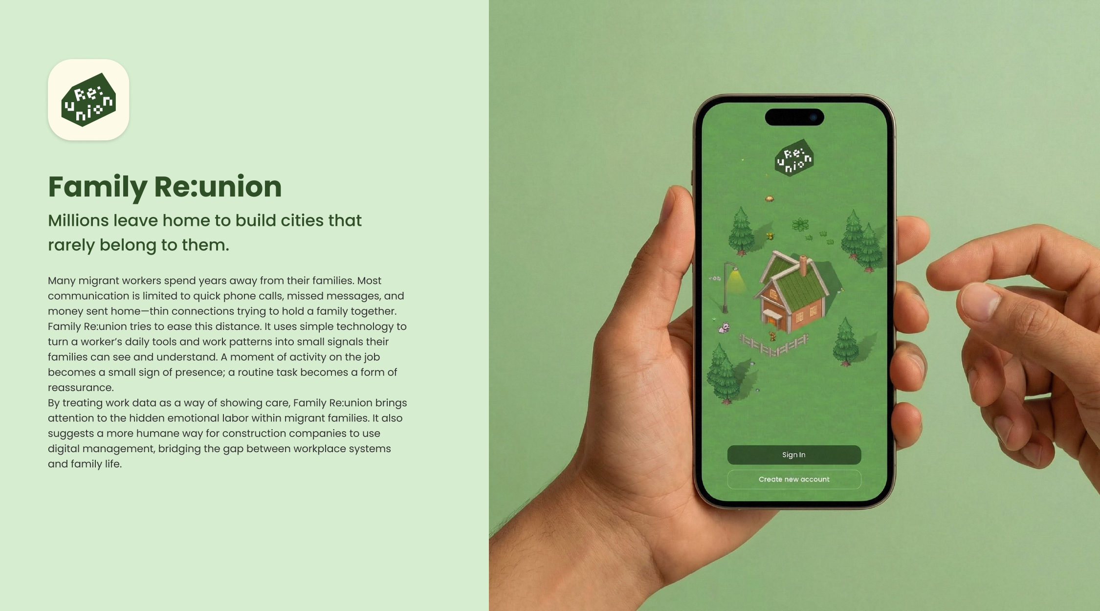 Through ambient signals, collaborative tasks, and lightweight interactions, family members can stay emotionally connected while participating in a shared digital space. By reframing work activity as a form of communication, Family Re:Union introduces a new approach to remote family connection—one where presence can be felt even when words are few.