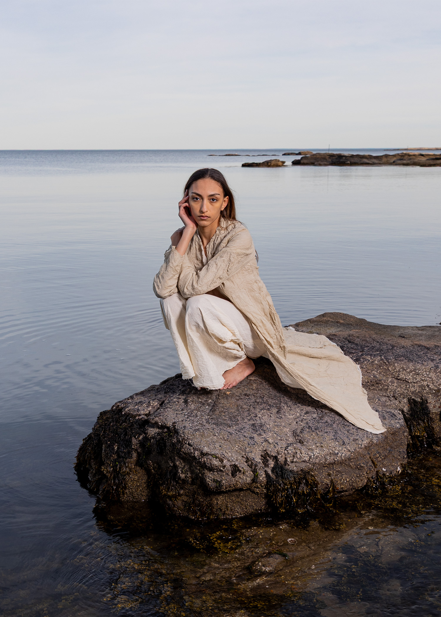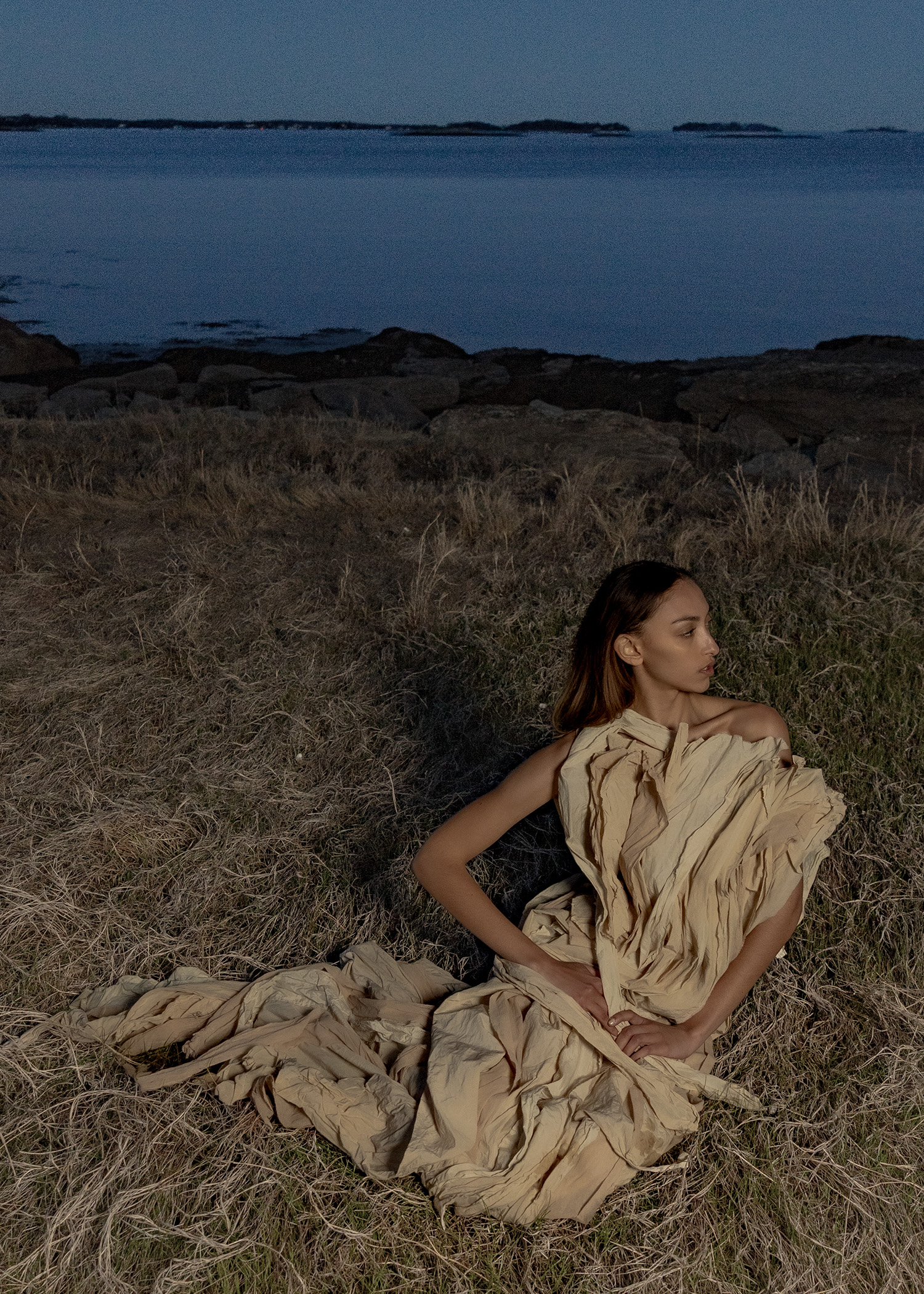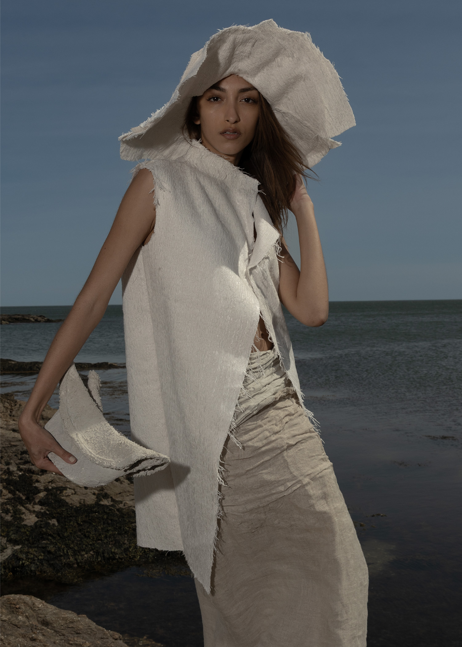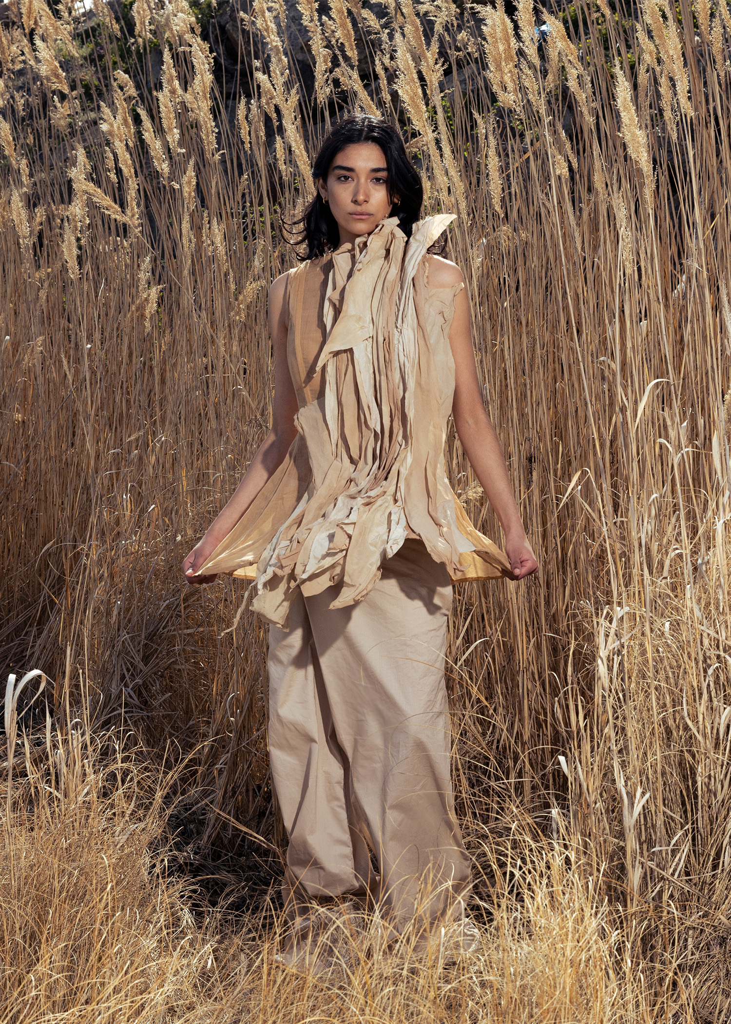 Zoen (landscaper in Japanese) embodies the art of landscaping the garden of life, capturing beautifully the art of intentionally crafting an inner and outer world that nurtures a balance between self-reflection and the inherent disorder of everyday existence. Much like a Zen garden, where every rock, ripple of sand, and blade of grass is thoughtfully placed to evoke stillness and contemplation, Zoen symbolizes the conscious act of designing one’s life in harmony with both the serene and the tumultuous aspects of the human experience. Rooted in the belief that fashion is a space for reflection, resistance, and renewal. Natasha approaches design as a collaborative dialogue between material and maker, body and form, past and future. She intentionally works with salvaged or naturally derived materials, allowing their history and texture to shape the silhouette. Each garment emerges from an intuitive process that honors the quiet language of fabric: how it collapses, crinkles, and reshapes with time, gravity, and touch.