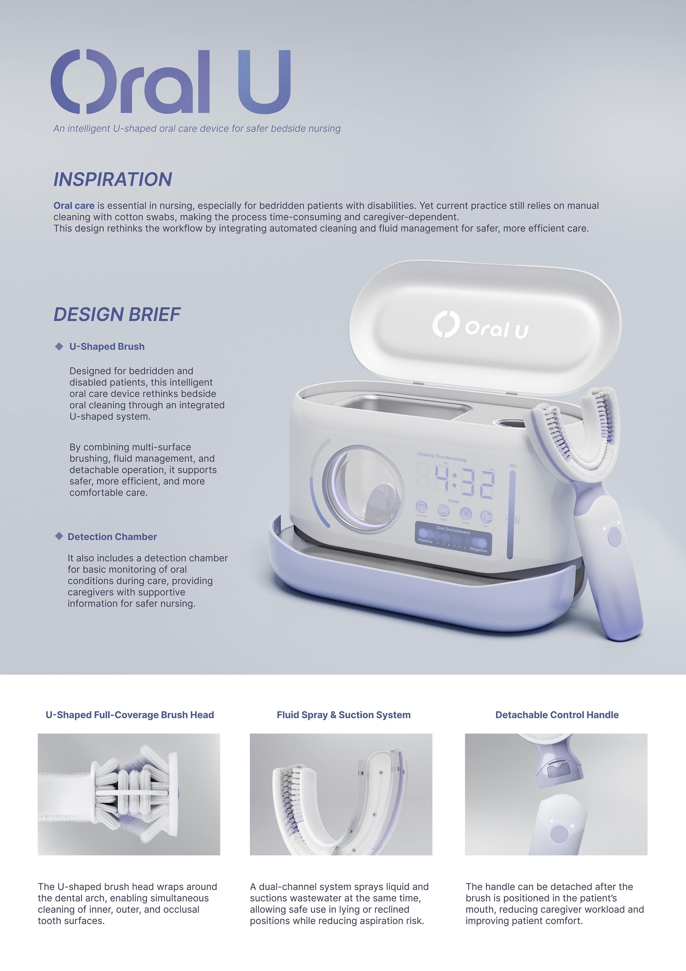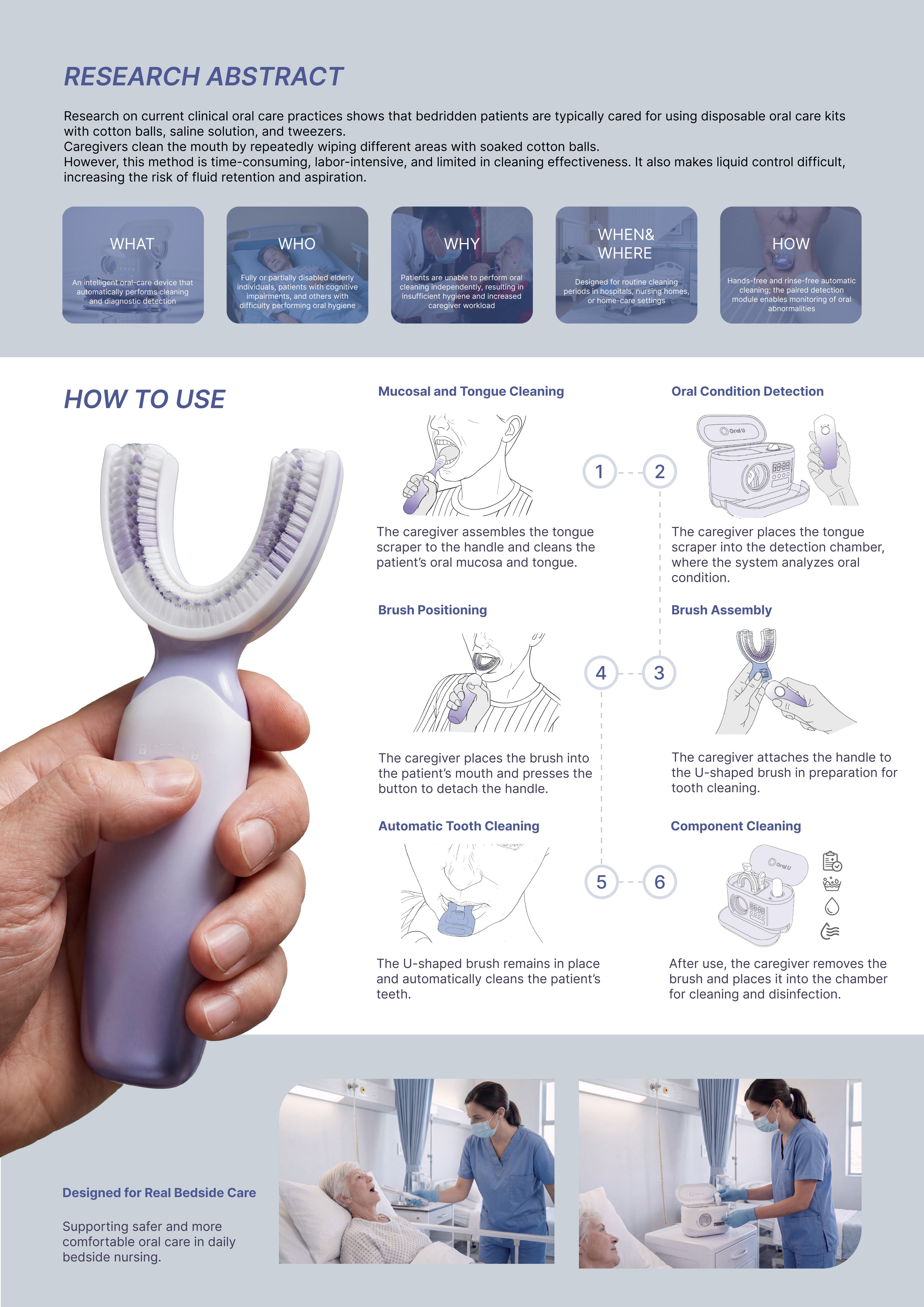 This project redesigns bedside oral care for bedridden and disabled patients by transforming a traditionally manual, experience-dependent process into an integrated system. Research on current clinical practice showed that oral cleaning still relies heavily on disposable kits and repeated wiping with cotton balls, which is time-consuming, difficult to control, and may increase aspiration risk.