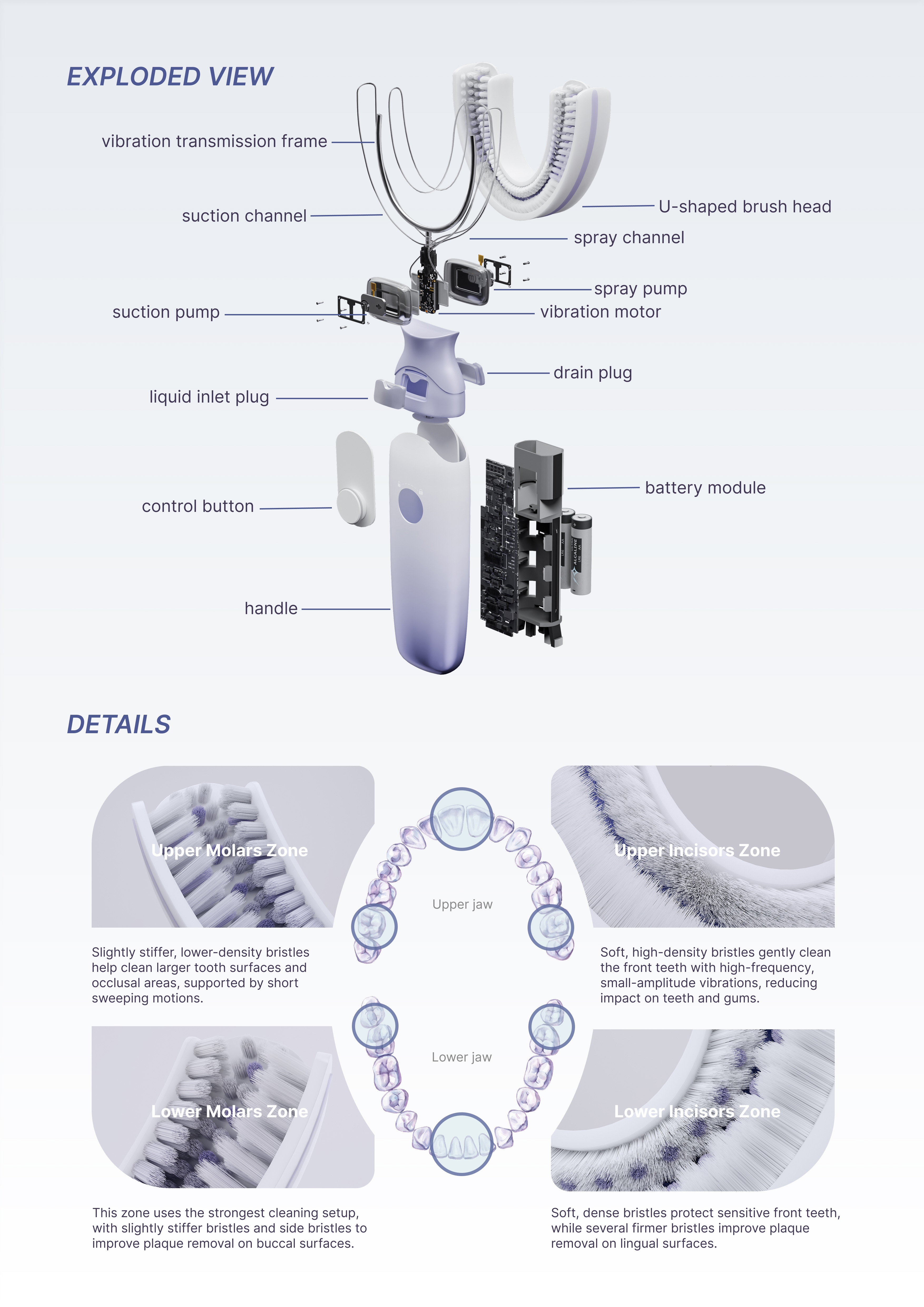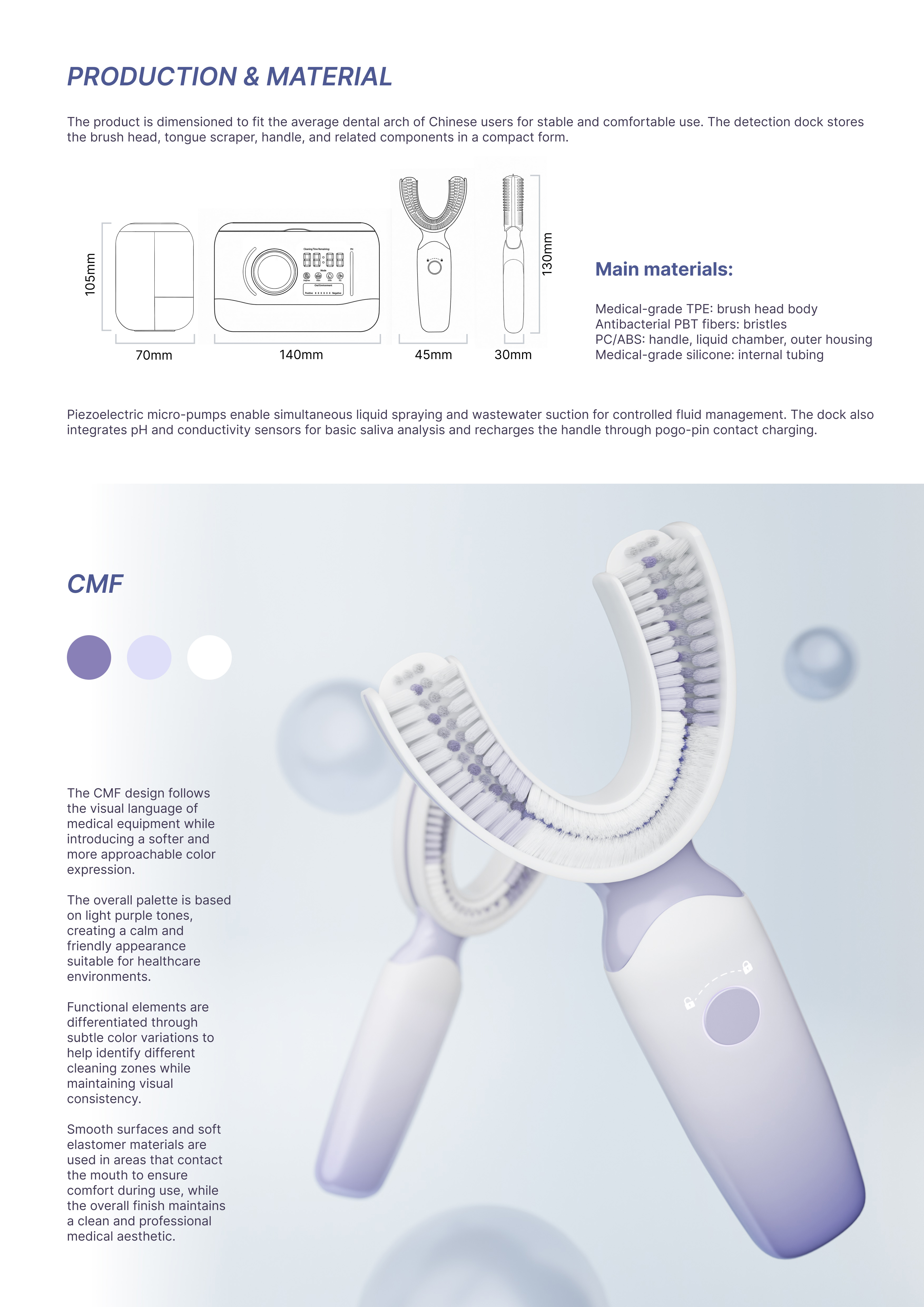 To improve cleaning performance, the brush head adopts a zone-based bristle strategy for different tooth regions, balancing gentleness and plaque removal according to clinical needs. Beyond cleaning, the dock extends the workflow through oral condition detection based on residual saliva collected from the tongue scraper. It also integrates ultrasonic self-cleaning, component storage, handle charging, wastewater collection, and a visual information panel, bringing monitoring and maintenance into one compact unit.