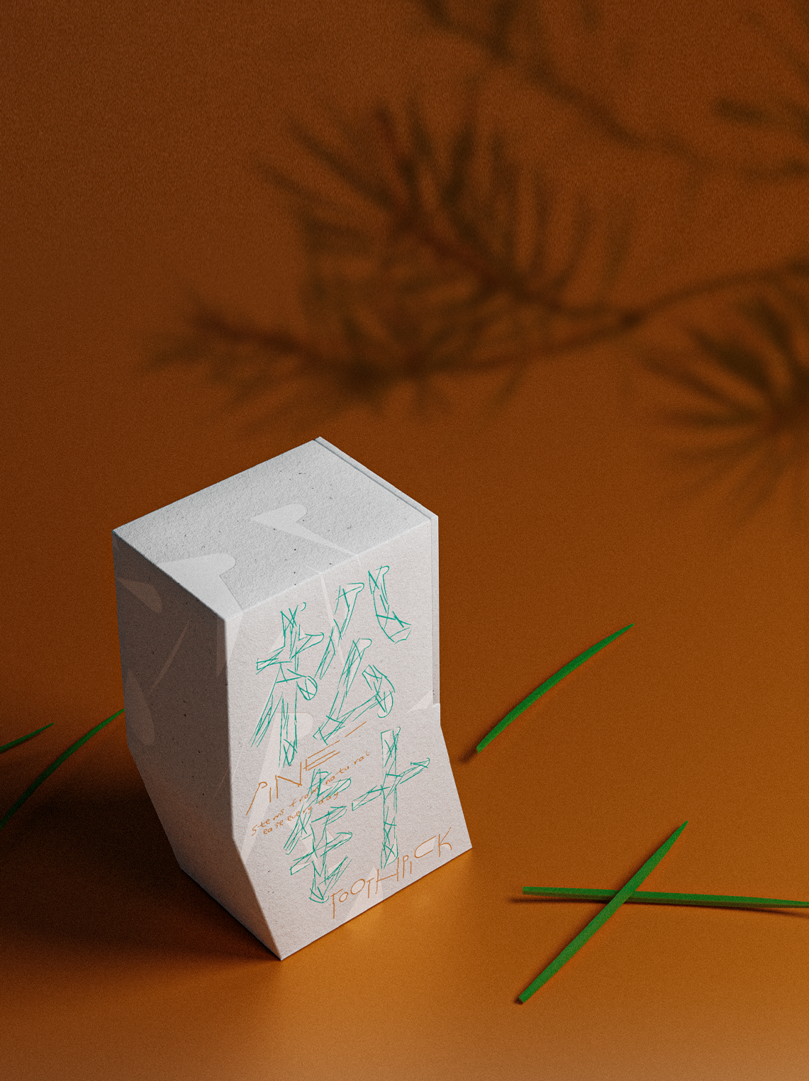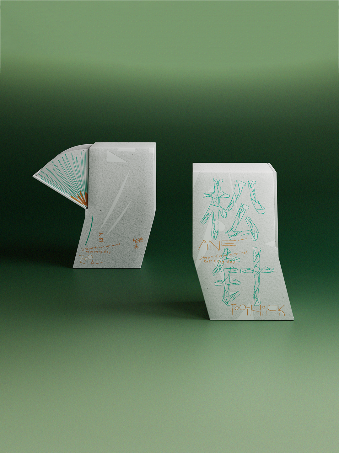 PINE TOOTHPICK is a toothpick design inspired by pine needles. In Chinese culture, the pine tree carries profound and timeless significance, symbolizing unyielding integrity, sincerity in welcoming guests, and its fresh fragrance evokes a sense of purity. We designed green, pine needle-shaped toothpicks to break away from the mundane appearance of ordinary toothpicks, evoking a sense of vitality, naturalness, and delight. Made from HIP (High Impact Polystyrene), it mimics the natural curve of real pine needles, reflecting the resilience of pine. A subtle pine scent and lifelike texture restore the essence of nature. The paper packaging box is shaped to imitate the curvature of a pine branch. When you pull open the drawer, the arrangement resembles a cluster of pine needles, revealing the green, needle-like toothpicks inside.