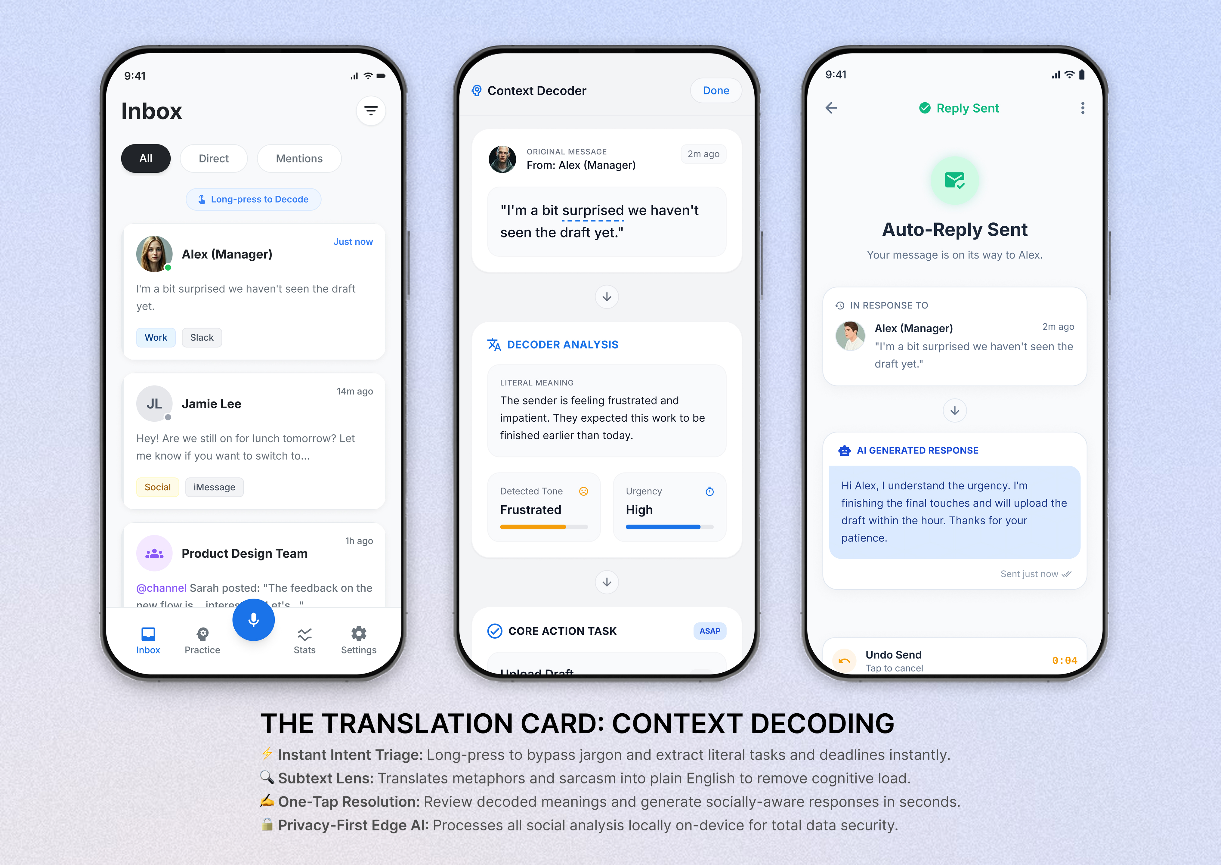 Real-time Decoding: The system translates sarcasm, idioms, and indirect language into literal meaning across communication threads, ensuring users never miss the subtext of fast-paced discussions.